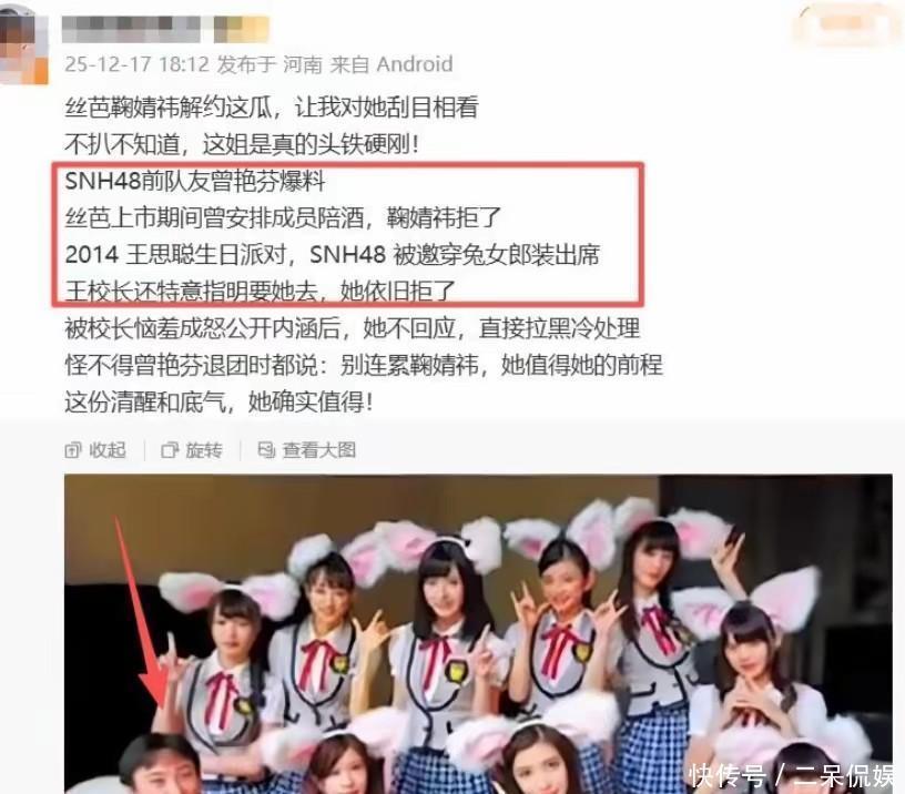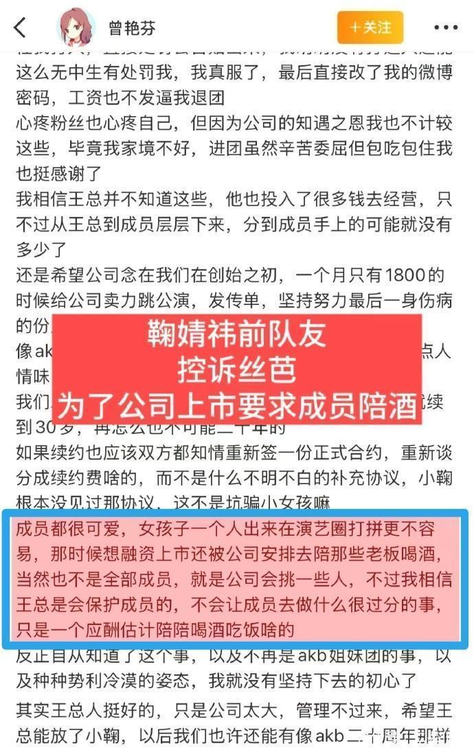 随后,鞠婧祎的同期队友曾艳芬爆料。在早年的公司里,为了能拉来投资,经常安排年轻女艺人参加高端酒局。至于需要做什么,大家自行脑补吧。